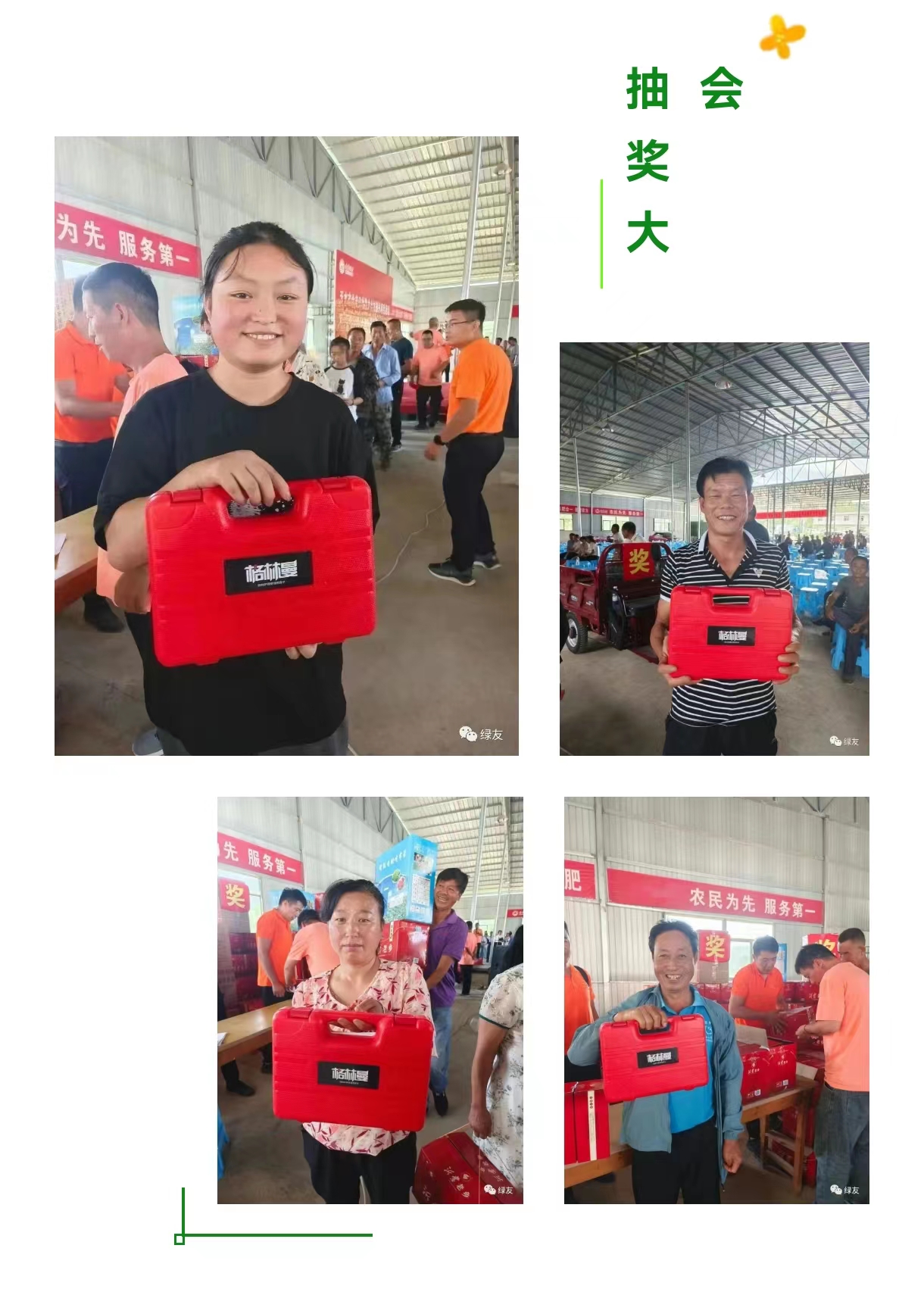 西安綠友園林機(jī)械有限公司寶雞分公司攜手某公社分別于8月24日和9月3日舉辦助力鄉(xiāng)村振興項目千人抽獎大會。每場次參會人員均達(dá)千余人,綠友公司的格林曼電動修枝剪作為獎品,廣受農(nóng)戶好評。