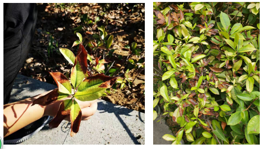 北方地區日照強度大,空氣濕度相對較較低,日灼現象十分明顯,紅葉石楠葉片邊緣受高溫影響大量失水導致葉片皺縮卷邊,開始枯黃,嚴重影響景觀效果。